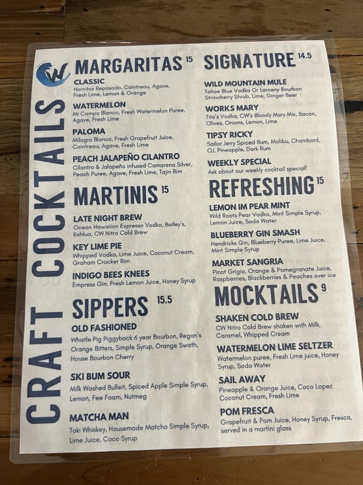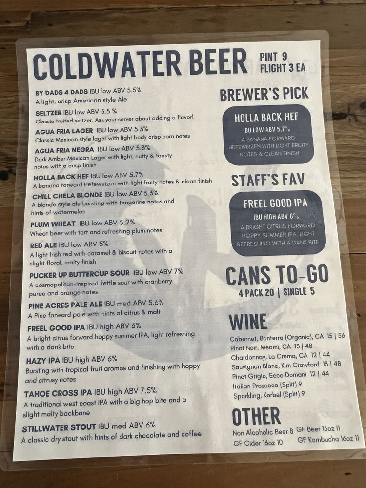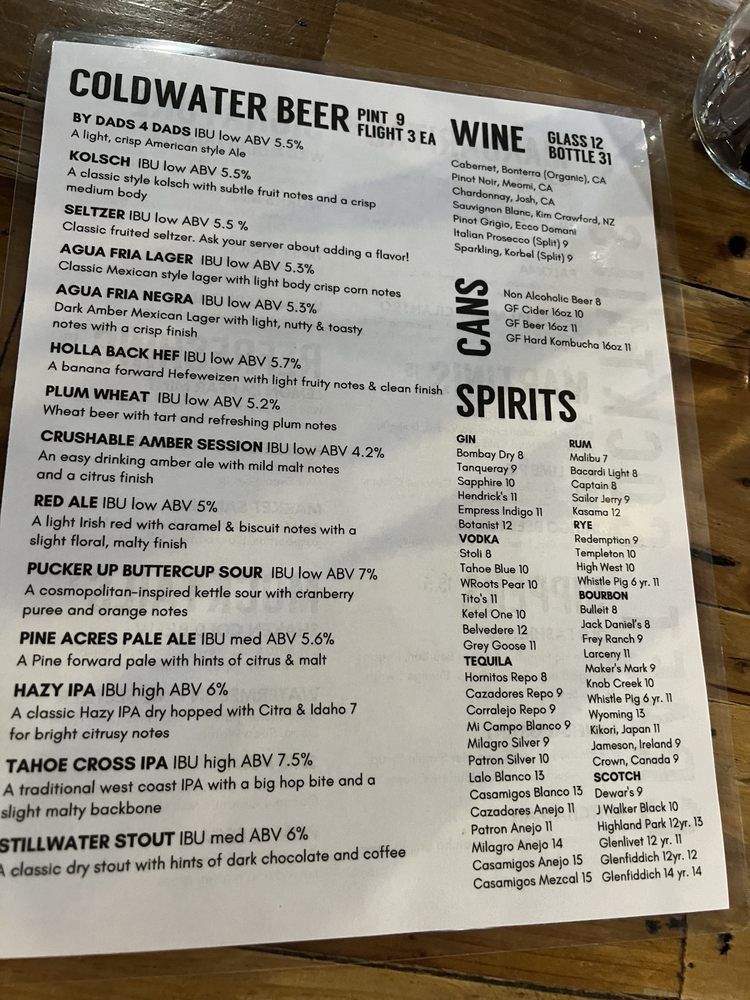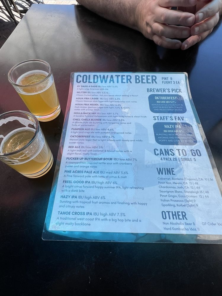Introducing the menu at Cold Water Brewery and Grill, a popular spot in South Lake Tahoe, CA. Known for their craft beers and delicious food, this brewery and grill offers a wide variety of options for all types of diners. Whether you're looking for pescatarian, vegan, or even limited vegetarian options, Cold Water has something for everyone. From their appetizers like elote and artichoke dip to main dishes like fish and chips, mahi-mahi tacos, and ahi poke bowls, the menu is sure to satisfy your cravings. Customers rave about the friendly service and cozy atmosphere, making it a great place to relax with friends and family. Don't forget to try their signature cocktails and beers while enjoying outdoor seating or catching a game on their big TV. Whether it's a warm summer day or a cold snowy evening, Cold Water Brewery and Grill is the perfect spot to indulge in good food and drinks.
